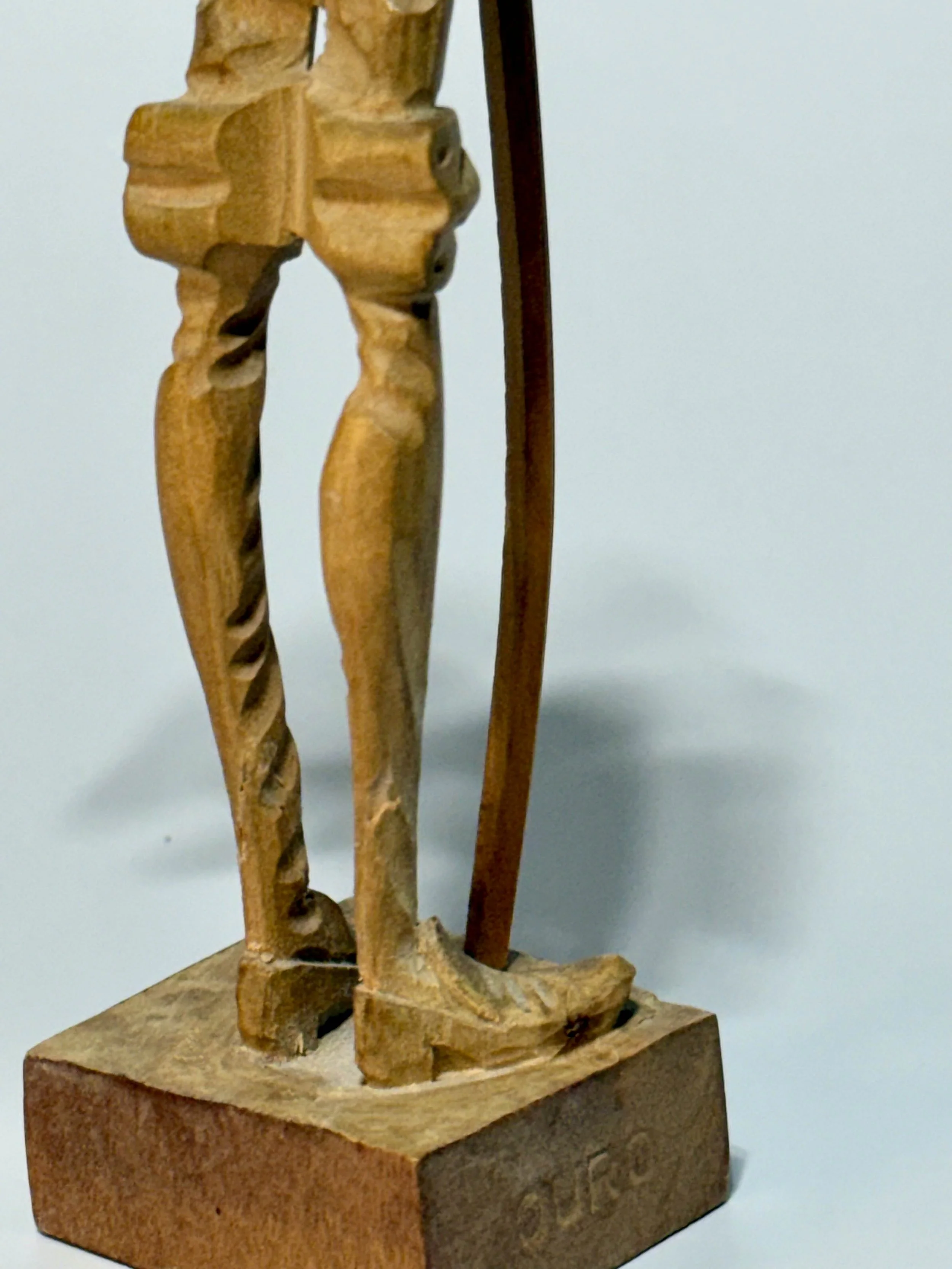 In 1956 my father gave me a small wood sculpture of Don Quixote. Only 8 “ tall, plus or minus, it was a delicate piece depicting a bold stance of a very thin, tall old man. Very light in weight and pale in color, it was stained with light orange, yellow and tan.