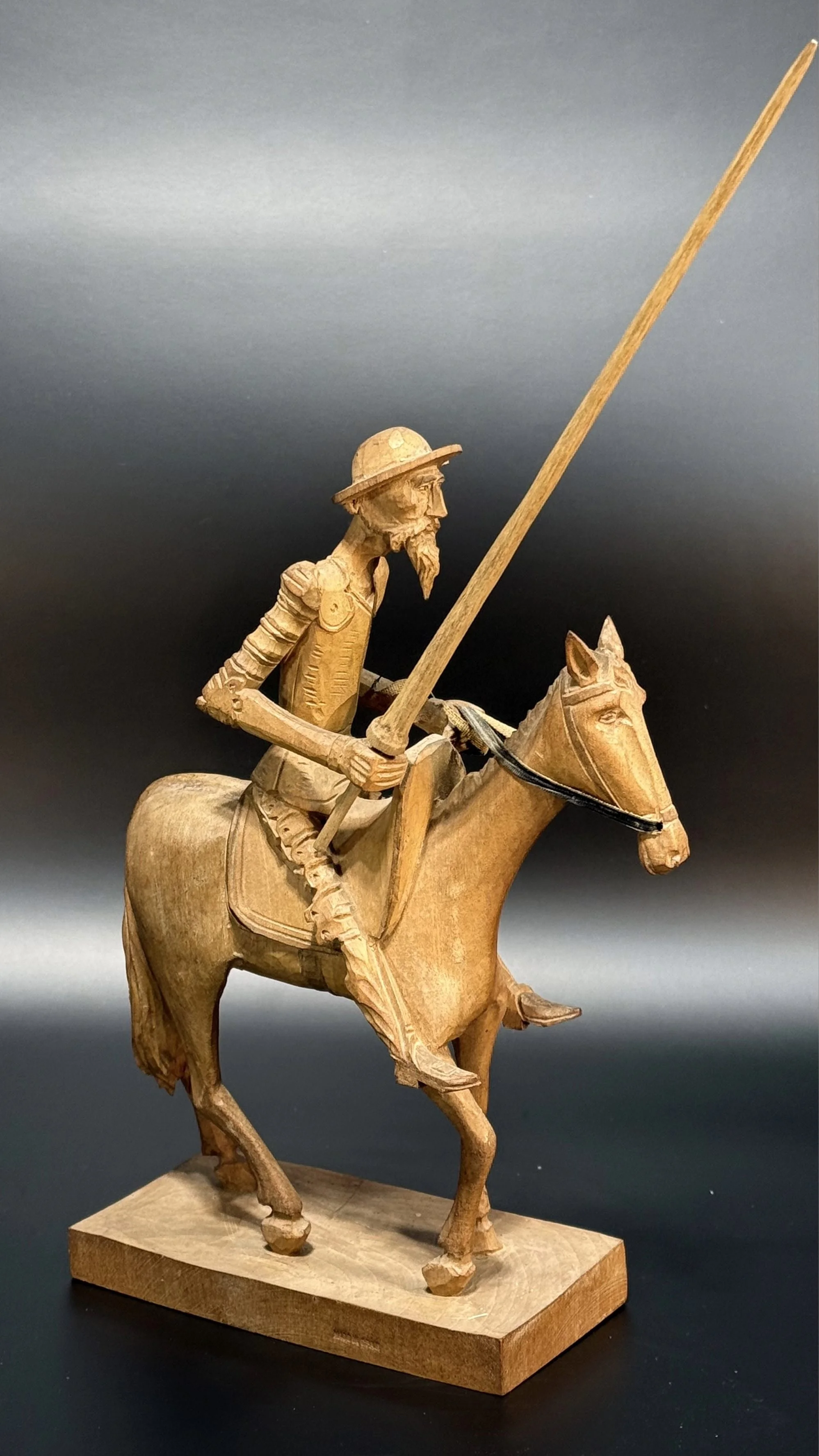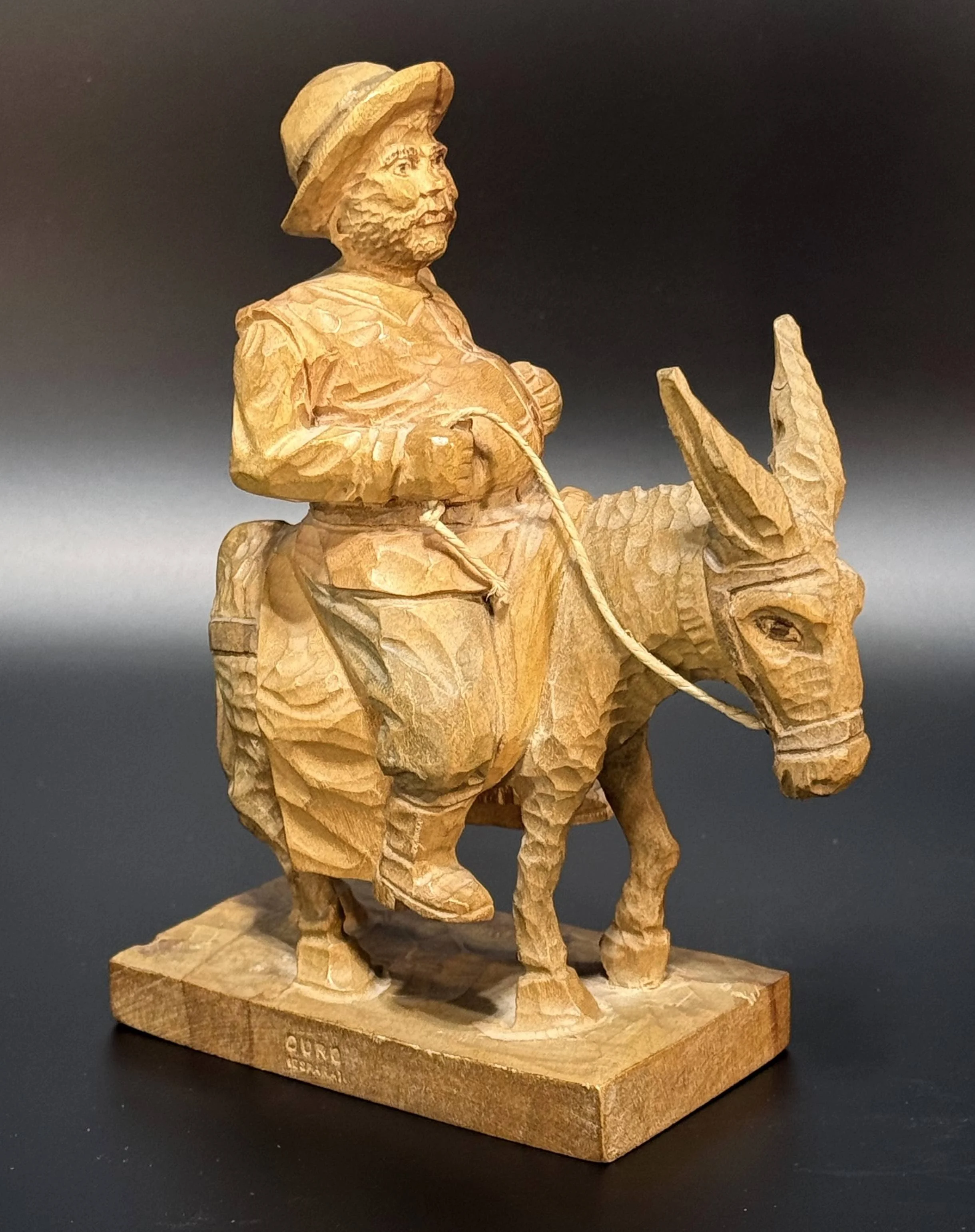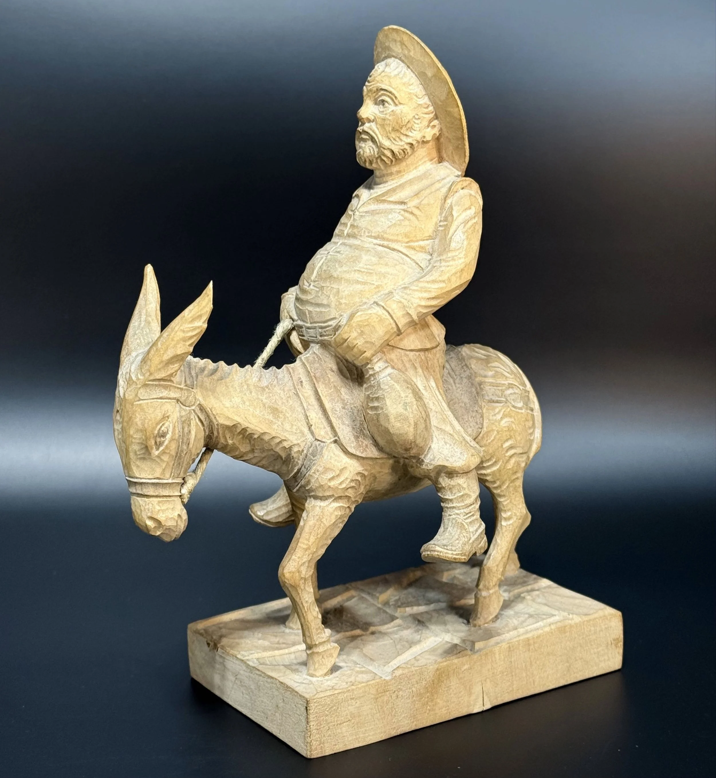 Description: Two separate figures meant to be paired. Don Quixote is riding his horse Rocinante, and Sancho Panza is riding his donkey Dapple.